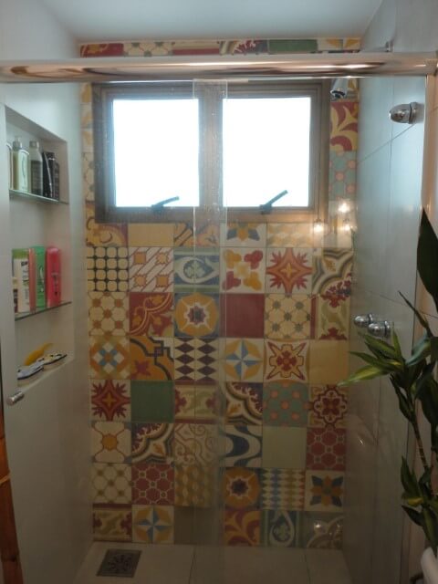Além disso, para quem busca uma opção colorida, mas sem ficar muito exagerado, pode optar também por colocar o azulejo colorido e a maioria branco. O azulejo branco irá auxiliar a deixar as cores mais suaves, sem que o ambiente fique pesado.