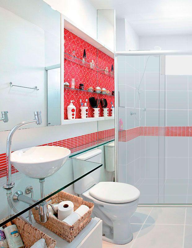 O vermelho dá a sensação de luxo e requinte, mudando a ideia de que o banheiro é um local que não merece glamour. As pastilhas na parede conseguem essa função, os móveis nessa cor deixam o banheiro elegante. Pequenos acessórios também são usados para elevar o visual do espaço.