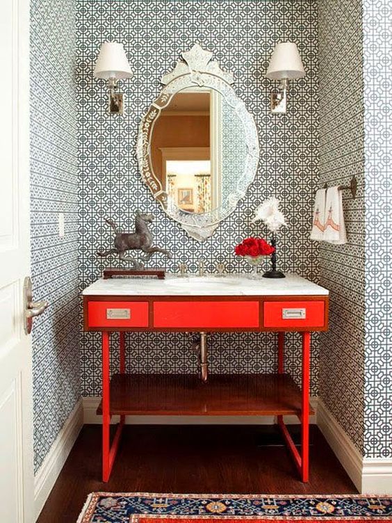 8- Se a parede for inteira pintada de vermelho, tenha cuidado ao inserir elementos, use um espelho mais neutro e móveis brancos para equilibrar