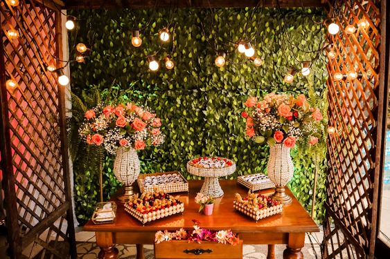 36- Transforme a mesa onde as comidas serão servidas com um lindo muro inglês decorado