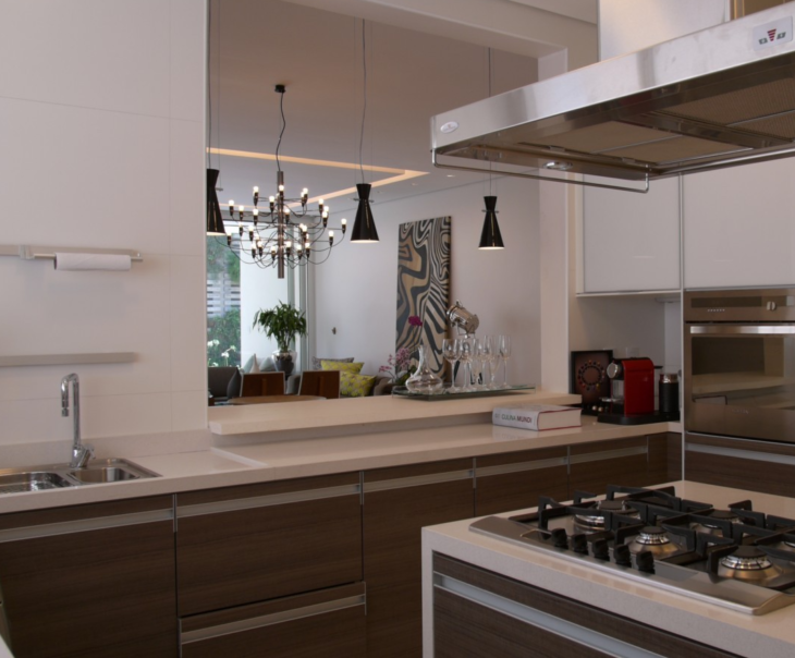 Então procure espalhar pendentes e instalar um intensificador. Desse modo você pode deixar a luz bastante acesa quando estiver cozinhado e abaixar ela na hora da refeição para que o ambiente fique agradável.