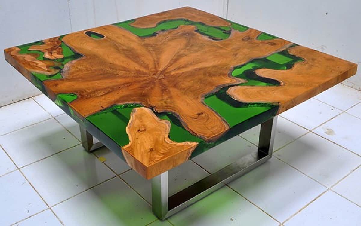 No caso das mesas resinadas, os tipos mais comuns utilizados são a resina de poliuretano ou a resina de epóxi, também usadas para fazer o piso “porcelanato líquido”, móveis ou cobrir bancadas.