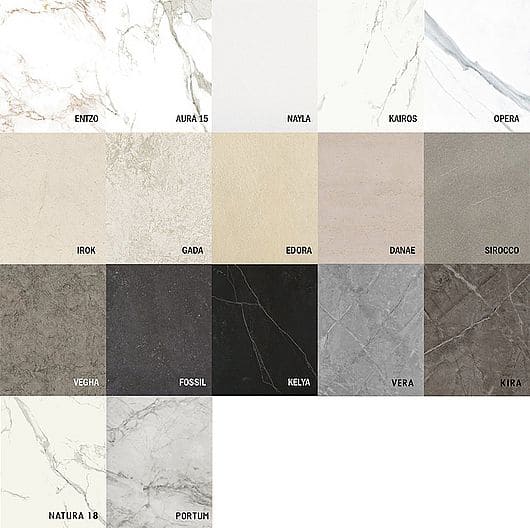 São mais de 50 cores disponíveis para escolher, distribuídas em várias linhas. A maioria delas conta com tons neutros, mas é possível encontrar peças com veios e texturas de pedra, que lembrem mármore e até cimento queimado. As principais e mais procuradas são as cores: Aura, Entzo e Kelya.