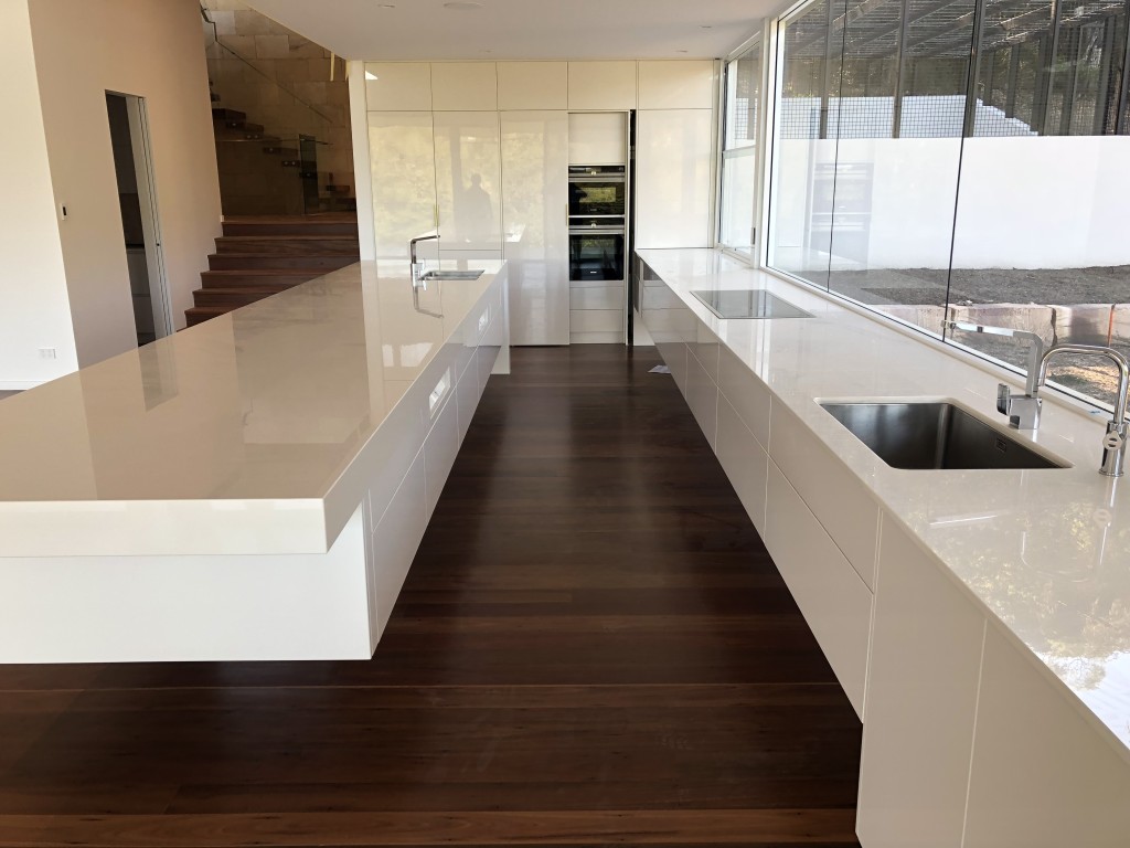 67- Os móveis brancos ficaram incríveis com o revestimento da bancada em Dekton alguns tons mais escuros