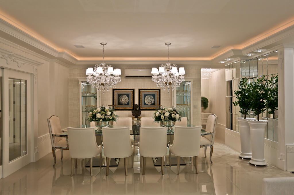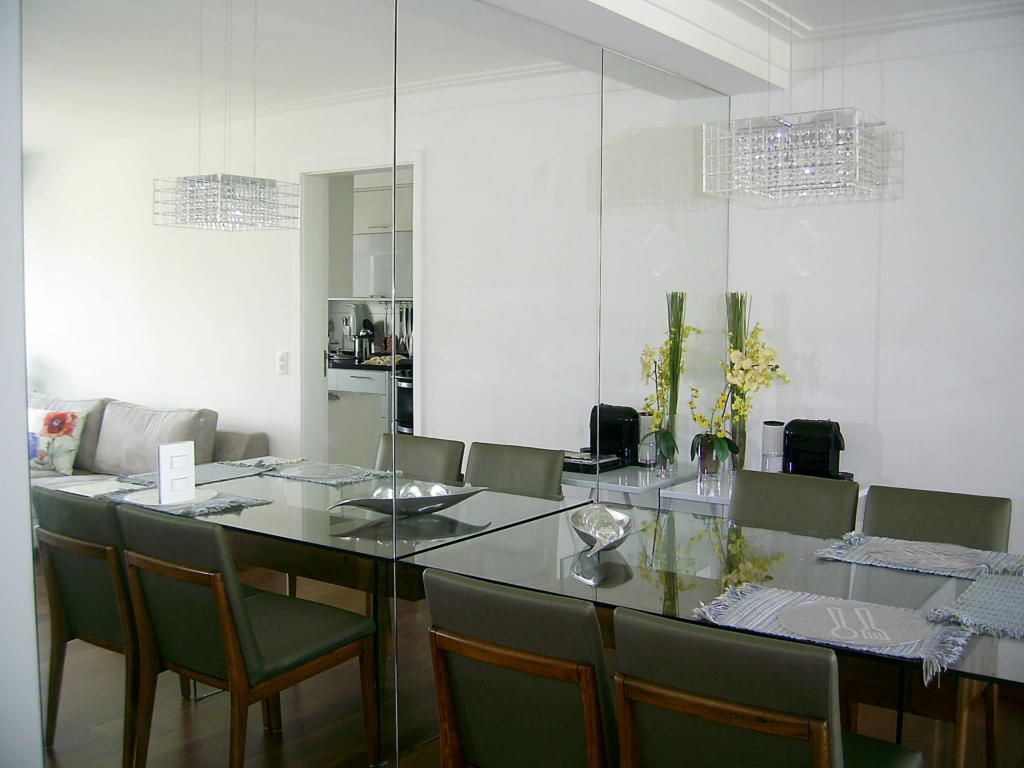 São muitas as alternativas do uso do espelho bisotado na sala. Próxima a mesa de jantar, é interessante inserir uma peça de parede inteira, horizontal, ampliando o espaço horizontalmente. Para outras partes do espaço, espelhos emoldurados como peças clássicas são belíssimas alternativas.