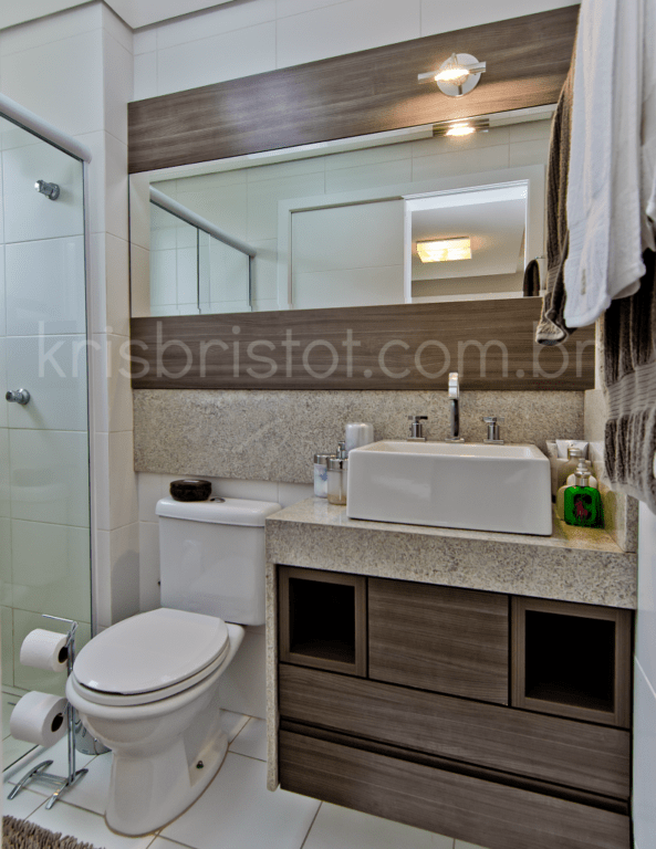 Uma opção bastante funcional e bonita para o banheiro é um espelho bisotado que cubra toda a parede. A escolha ainda cria a sensação de maior amplitude do banheiro, e dá ar mais sofisticado ao espaço.