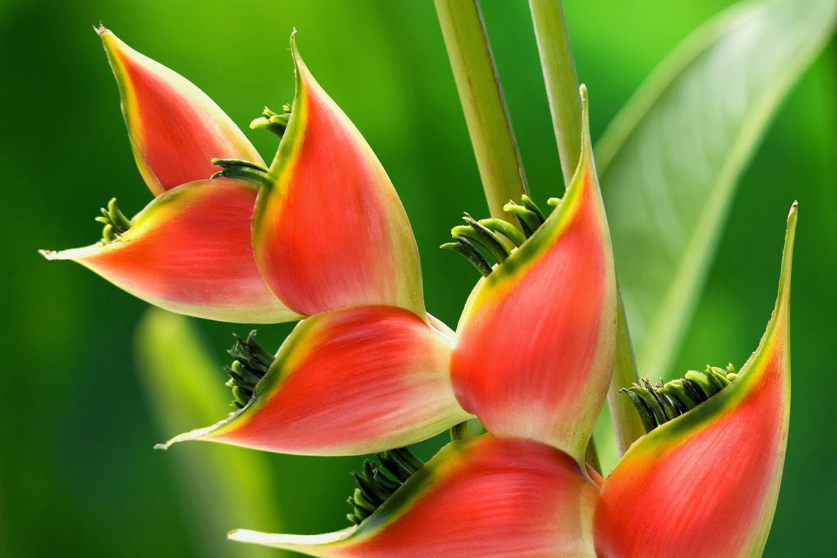 Helicônias são plantas herbáceas rizomatosas, que medem de 50 cm a 10 metros de altura, conforme a espécie. Elas costumam ter hastes longas, eretas ou pendentes, com gomos grossos, vermelhos e amarelos, semelhantes aos bicos dos tucanos. Elas parecem pesadas, mas são levíssimas, e protegem as flores verdadeiras, que são brancas, escondidas entre esses gomos.