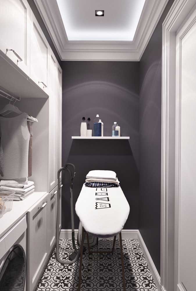 11- O papel de parede cinza e trabalhado é uma opção mais ousada e prática