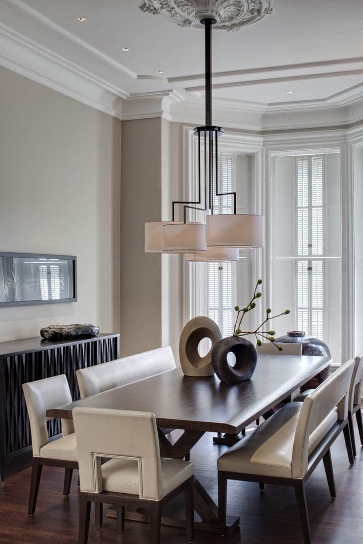 12 – Você dificilmente irá encontrar uma sala de jantar mais moderna do que esta abaixo! Tanto a mesa quanto o banco gritam por modernidade, além de toda a decoração ao redor combinar muito bem com esta ideia de modernização do ambiente!