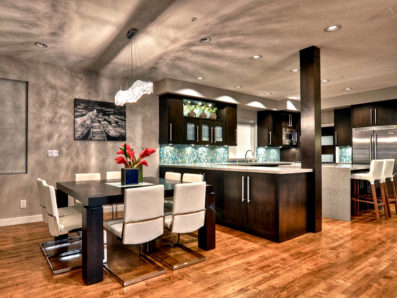 7 – A sala de jantar abaixo grita por modernidade, sendo que os enfeites tanto do lustre quanto os que vemos nas paredes combinam muito bem entre si